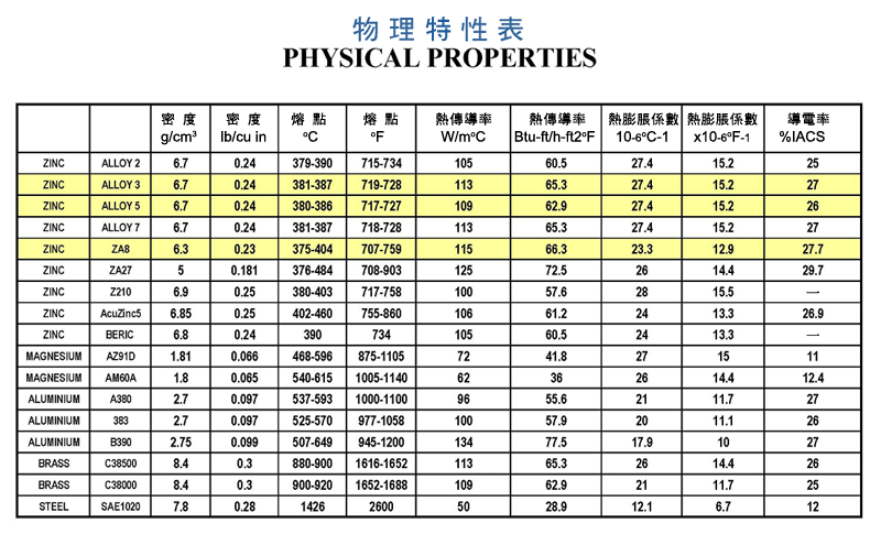 鋅合金物理特性表